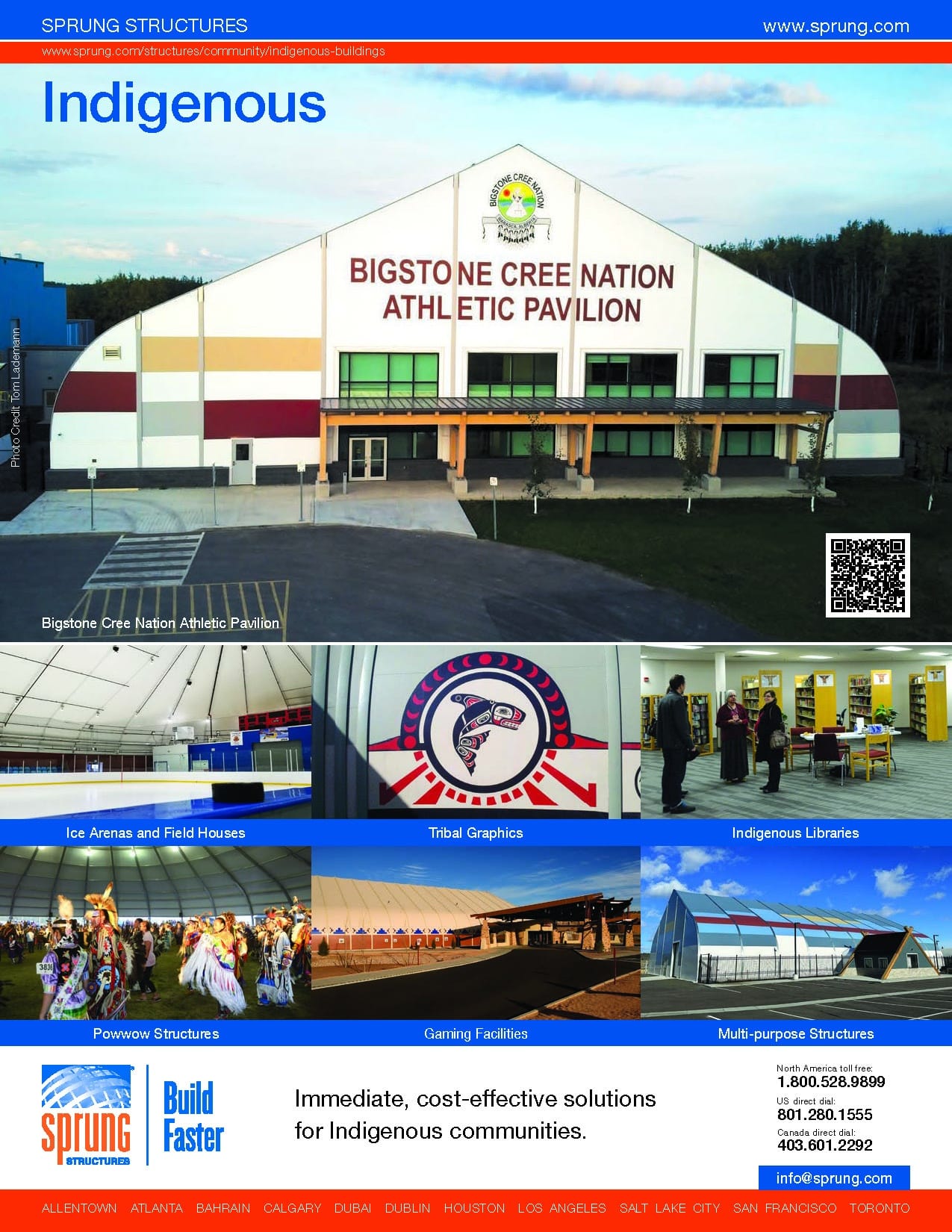 Sprung has worked with Indigenous communities on many projects, from multi-purpose recreation facilities, like the one built for the Blood Tribe in Standoff, Alberta; to casinos like the Fire Rock Casino in New Mexico and the Point Casino in Puget Sound, Washington State; to powwow tents, such as the ones built for Enoch Cree Nation in Edmonton, Alberta.