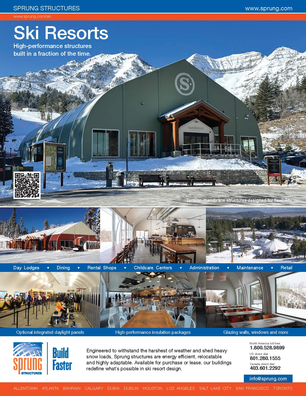Many ski resort managers and operations directors have already made Sprung their building solution. Sprung structures have been used as ski facilities for resorts like Mammoth Mountain, California, and Vail, Colorado; as dining facilities at The Canyons Ski Resort; as a member lounge facility for Bretton Woods Alpine Club in New Hampshire; as restaurant and retail space for Sierra-at-Tahoe Ski Resort; and as lounge, rental shop, equipment storage and administration space at Tamarack Ski Resort in Idaho.