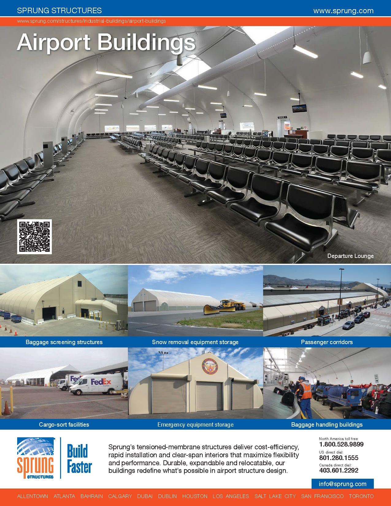 Sprung offers the fastest deployment of temporary airport buildings on the market. Minimal foundation is required to install baggage handling facilities, storage buildings, departure lounges, passenger corridors and all manner of airport facilities. Structures can be easily relocated to meet a variety of airport needs. With more than 12,000 installations around the world, Sprung technology has successfully solved building challenges in a wide variety of industries and applications, and airport buildings are no exception. With our patented fabric membrane technology on all airport structures, you can rest assured that your structure will function successfully for years to come. If you’re considering an airport structure, contact Sprung to discuss how a tensioned fabric structure might save you time and money.